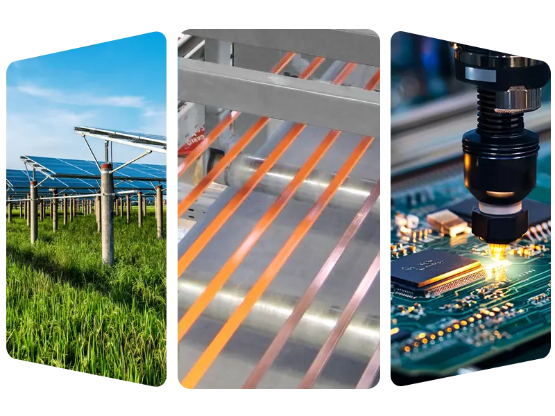 • Qada fotovoltaîk: hilberîna girseyî ya rîbên welding û otobusên fotovoltaîk ji bo alîkariya pêkhateyan ku elektrîkê bi bandor bi rê ve bibin.